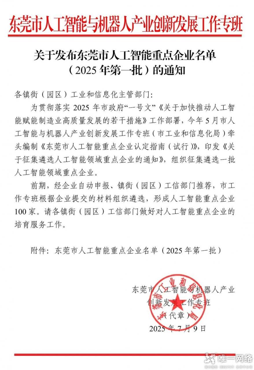 近日,東莞市人工智能與機器人產(chǎn)業(yè)創(chuàng)新發(fā)展工作專班正式發(fā)布《東莞市人工智能重點企業(yè)名單(2025 年第一批)》,唯一網(wǎng)絡(luò)憑借在人工智能領(lǐng)域的戰(zhàn)略布局、技術(shù)積淀與產(chǎn)